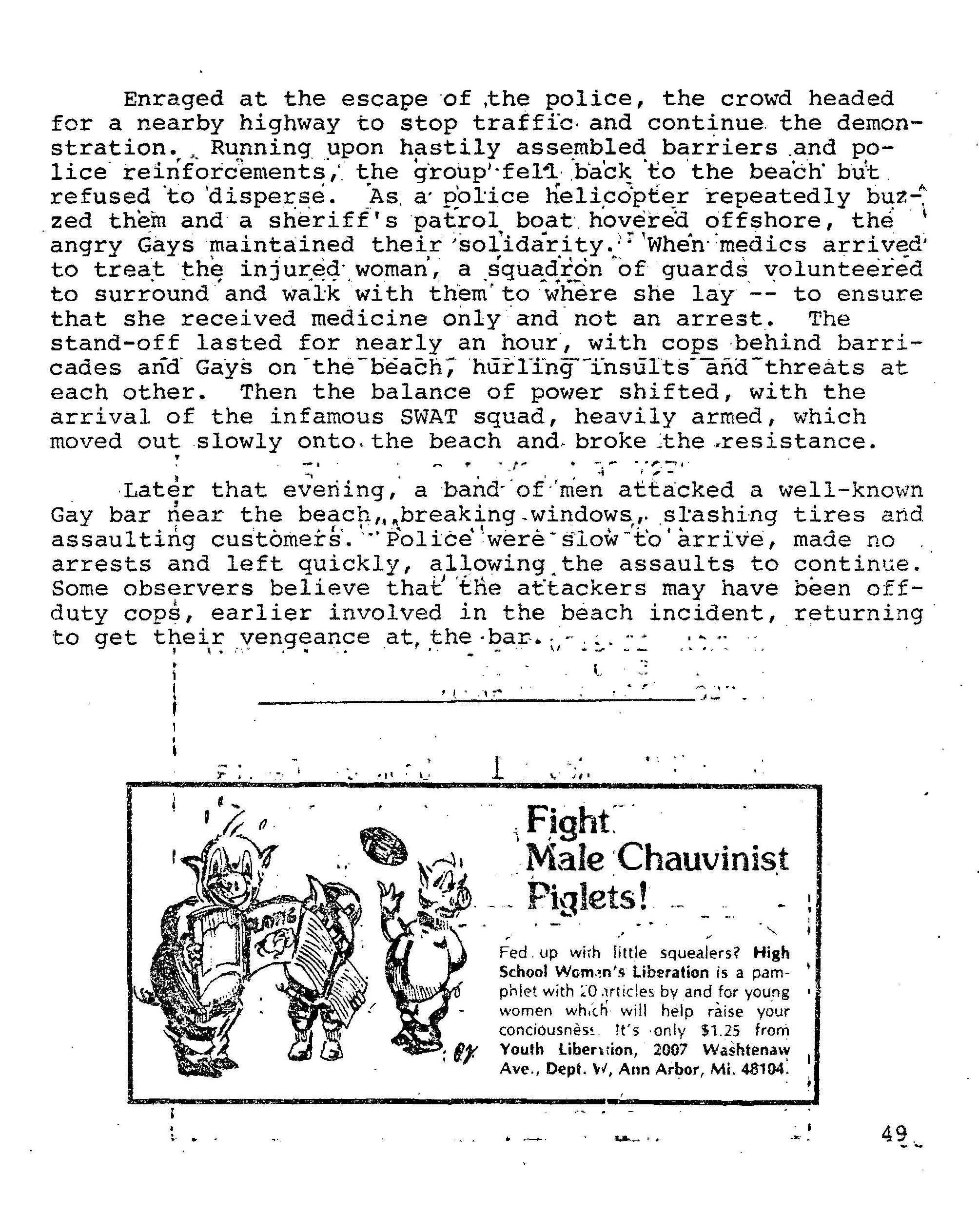 On Independence Day, 1976, queer beachgoers and allies took a stand in the face of police harassment “with a magnificent display of courage and unity.” Reportedly 2000 people were gathered at Will Rogers Beach to celebrate the July 4 holiday. When vice officers pulled two gay men out of the water and began beating them with batons, onlookers fought back, crowding around the officers in an attempt to dissuade them and eventually “pelting the cops with stone, sand, cans, and seaweed.” When one woman attempted to help one of the men beaten by the police, she was thrown to the ground and run over by the police jeep, needing to be hospitalized for leg injuries. The Los Angeles Times reported on the incident, in addition to other local and national publications, noting that several involved suffered minor injuries.
