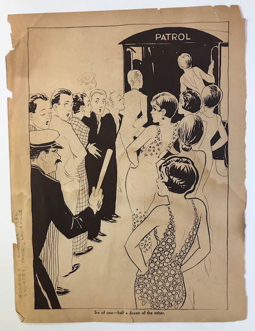 Top image: Six of One – Half a Dozen of the Other. Cartoon from Baloney Country Press, Louisville, 1932. Prostitution Subject File, ONE Archives at USC Libraries. Unknown artist.